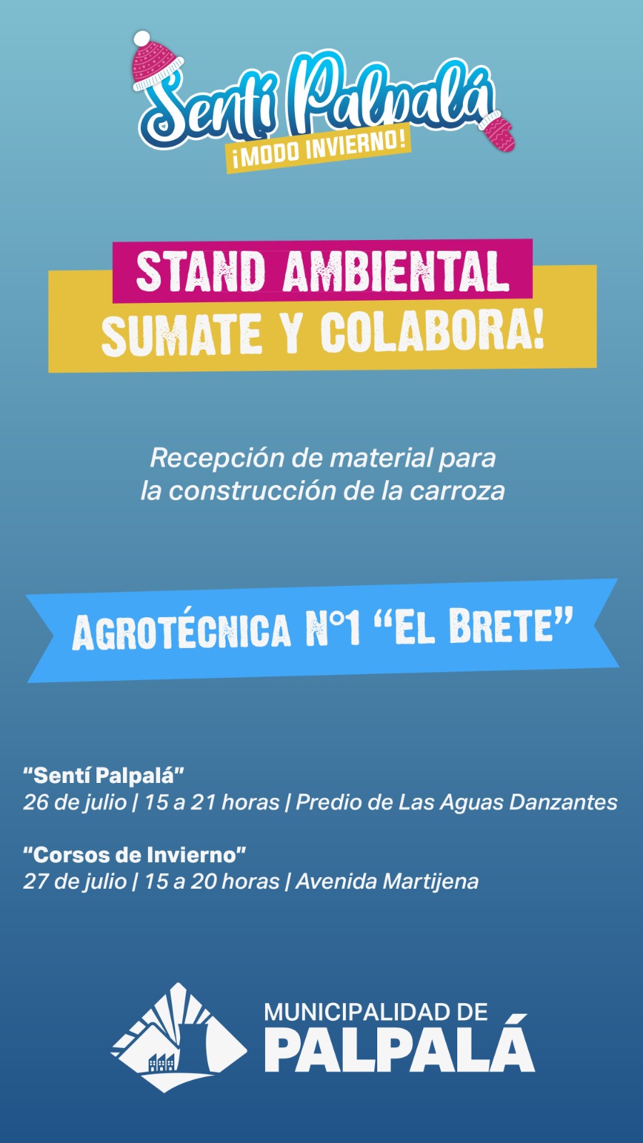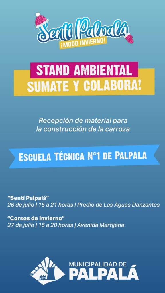 En el marco del segundo sábado del “Sentí Palpalá” que se llevará adelante el 26 del corriente en el predio de Las Aguas Danzantes de 15 a 21 horas; y “Los Corsos de Invierno” que se concretará el domingo 27 en avenida Martijena a partir de las 15 horas. La Municipalidad de Palpalá mediante la Dirección de Medio Ambiente dispondrá de un “stand ambiental”, donde se recepcionarán materiales para la construcción de sus carrozas. Este espacio contará con cuatro líneas de acción: Gestión de residuos sólidos urbanos; economía local y responsable; movilidad sostenible y participación comunitaria.
