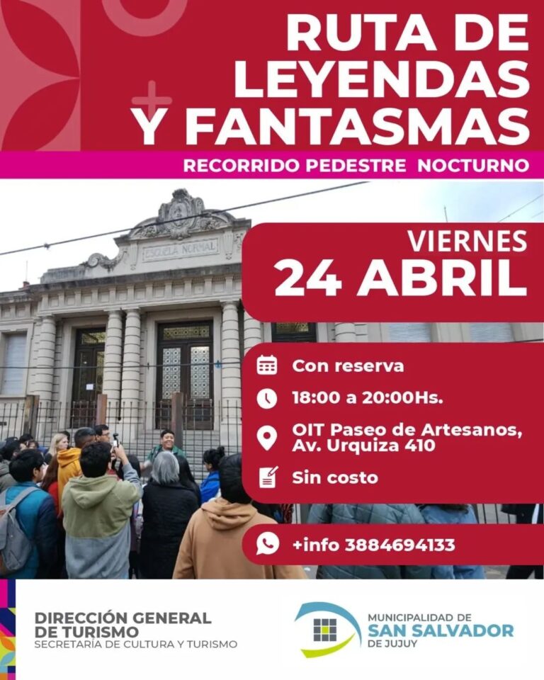 La Dirección de Turismo de la Municipalidad de San Salvador de Jujuy invita a la comunidad a participar de una travesía denominada “Rutas, leyendas y fantasmas”, que se llevará a cabo el próximo viernes 24 de abril de 18 a 20 horas. La actividad, que es gratuita y modalidad pedestre, partirá desde la Oficina de Información Turística (OIT) ubicada en el Paseo de los Artesanos, Avenida Urquiza 410.