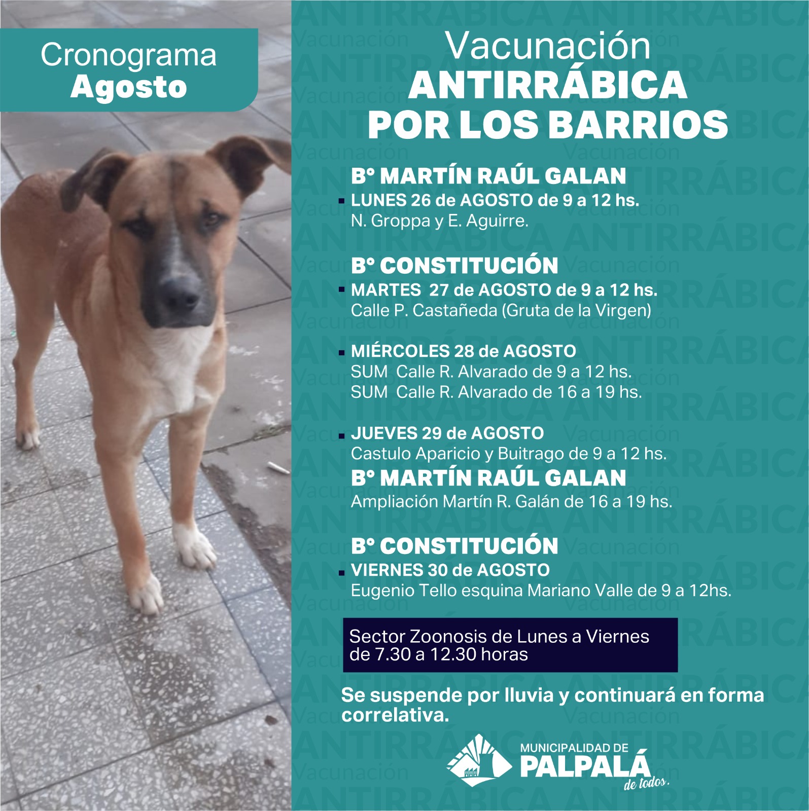 La Municipalidad de Palpalá informa del cronograma de vacunación antirrábica para la semana del 26 al 30 de agosto. En caso de lluvia se suspende la actividad para el día siguiente.