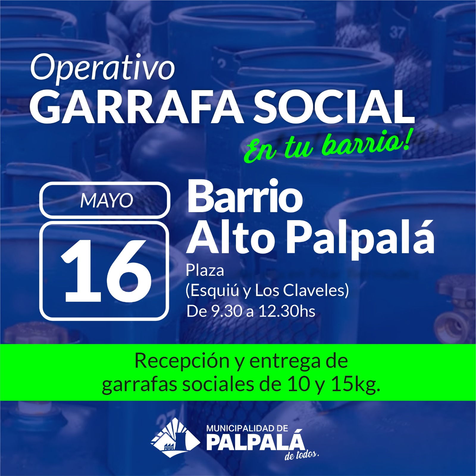 La Municipalidad de Palpalá informa que el operativo de Garrafa Social se llevará adelante este viernes 16 de mayo, de 9:30 a 12:30 horas. La asistencia se desdobla y alcanza a los barrios Alto Palpalá (Esquiú y Los Claveles) y 25 de Mayo (plaza al lado del SUM, sobre calle Mariano Moreno). Se continuará con la recepción y entrega de garrafas sociales de 10 y 15 kg.