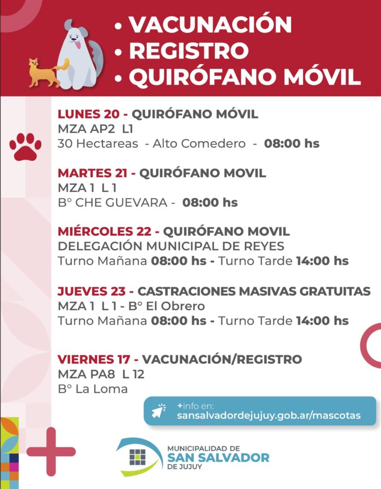 La Dirección de Zoonosis de la Municipalidad de San Salvador de Jujuy dio a conocer el cronograma de actividades correspondiente a la próxima semana, que incluye operativos de quirófano móvil, castraciones masivas y jornadas de vacunación y registro de mascotas en distintos puntos de la ciudad.